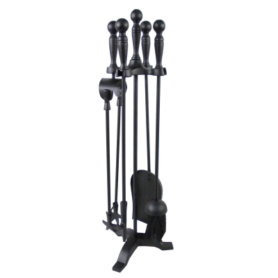 - This set includes essential tools for maintaining a fireplace, including a poker, brush, shovel, and tongs, all neatly displayed on a matching stand